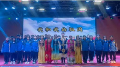 伴随着悠扬的旋律,我校本地学生身着整齐校服,新疆学子身着绚丽多姿的民族服饰依次登场,共同演绎大合唱《我和我的祖国》。校服的简洁大方与维吾尔族绣花长裙、哈萨克族头饰交相辉映,在舞台上绘就出一幅多彩斑斓的民族团结画卷,歌声中传递出对祖国的无限热爱与深情祝福。
